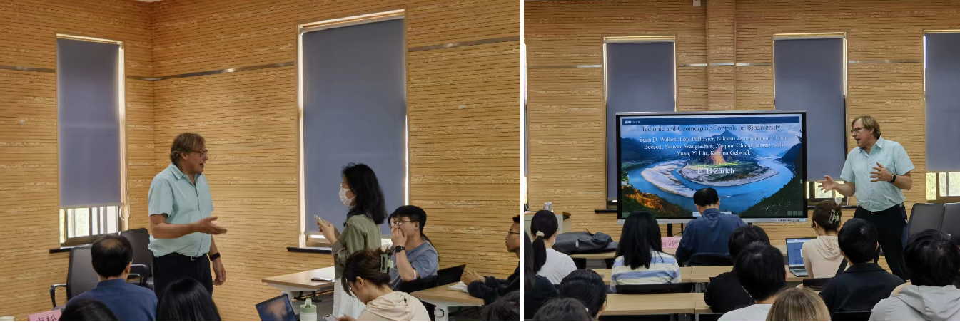 講座伊始,Sean Willett院士指出地球表層的地勢(shì)地貌格局、環(huán)境演化等對(duì)生物的分布規(guī)律和多樣性演化具有重要的控制作用,而構(gòu)造過(guò)程是控制地球表層演化過(guò)程的關(guān)鍵路徑。他以構(gòu)造和地貌演化如何控制全球生物多樣性為科學(xué)問(wèn)題,選取不同構(gòu)造背景的地區(qū)(包括中國(guó)橫斷山脈,馬達(dá)加斯加),定量探討構(gòu)造活動(dòng)、地表演化對(duì)生物多樣性的影響。研究手段綜合地質(zhì)和生物數(shù)據(jù),并通過(guò)新開(kāi)發(fā)的數(shù)值模型以量化構(gòu)造活動(dòng)、地表演化與生物多樣性之間的關(guān)系。講座過(guò)程中,Sean Willett院士結(jié)合自身豐富的野外調(diào)研實(shí)踐經(jīng)驗(yàn),借助數(shù)字模型研究,將復(fù)雜的地球科學(xué)問(wèn)題形象化、具體化,使得地理知識(shí)更加貼近學(xué)生認(rèn)知實(shí)際,拉近同學(xué)們與地理學(xué)科之間的距離,極大地激發(fā)了學(xué)生對(duì)地理學(xué)科的興趣度和認(rèn)同感。