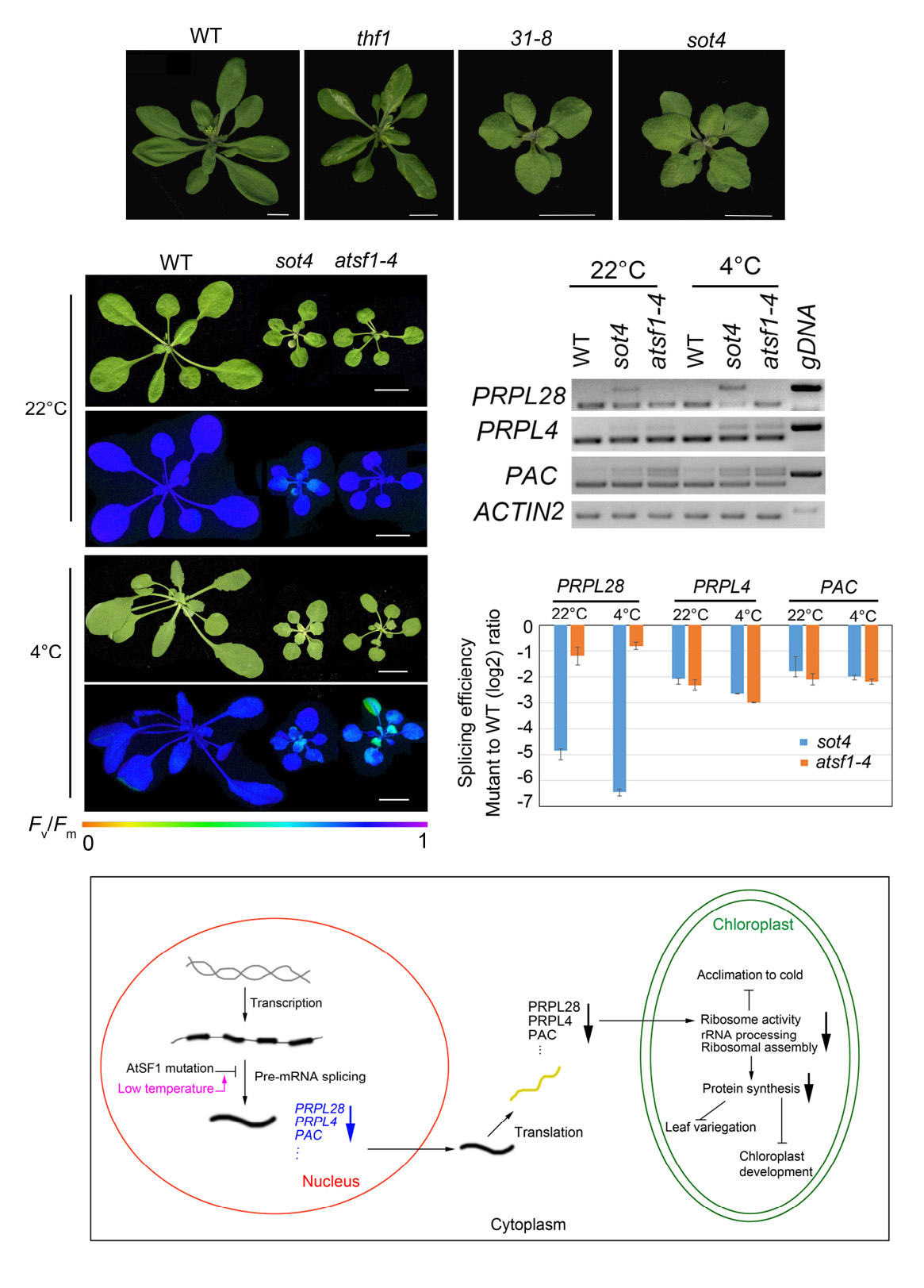 黃繼榮課題組一直致力于核基因編碼的葉綠體蛋白質THF1 (THYLAKOID FORMATION1)的功能與作用機理研究。基于THF1突變產生斑葉的表型,課題組通過構建thf1為背景的突變體庫,篩選斑葉表型消失的突變體,獲得了一系列thf1的回復子,發現多個回復子編碼定位于葉綠體的核糖體亞基及核糖體活性調節因子,表明thf1斑葉表型與葉綠體翻譯過程高度相關。與之前報道的斑葉回復子都編碼定位于葉綠體的蛋白質不同,本研究介紹了一個新型的斑葉回復子,命名為sot4,其編碼一個定位于細胞核并在真核生物中高度保守的RNA剪接因子(Splicing Factor1,SF1)。sot4屬于錯義點突變,導致第198位的甘氨酸殘基變成了精氨酸殘基(SF1G198R)。sot4與完全敲除突變體一樣,呈現植株矮小、短根、對激素ABA超敏感,以及在低溫(4℃)下生長出現新葉嚴重黃化但能慢慢轉綠的表型。