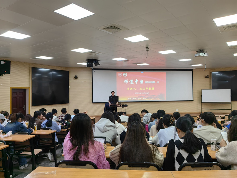 為推進我校大思政課與師德養成課程群建設,以教育家精神引領師范生卓越成長,馬克思主義學院自本學期開始面向全校師范類專業本科生開設“師道中國”系列講座。10月27日上午,“師道中國”系列講座迎來第一講,由中國倫理學會教育倫理專業委員會主任、上海師德研究與評價中心主任王正平教授主講“立德樹人:新時代師德師風建設的核心要義與基本要求”。講座由馬克思主義學院周治華副院長主持,馬克思主義學院何玉海教授全程參加。來自學前教育學院的150余名本科生現場聆聽了本次講座。