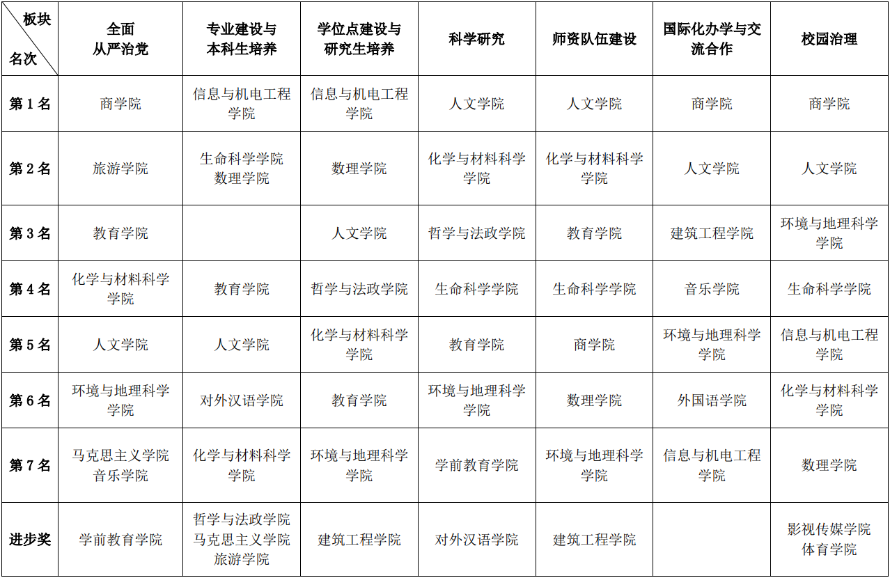 2023年度學院績效考核已經結束,經定量考核和匯報評議綜合評價,獲得各板塊前七名,以及在各板塊排名中與去年相比有大幅提升獲得進步獎的,有以下各學院: