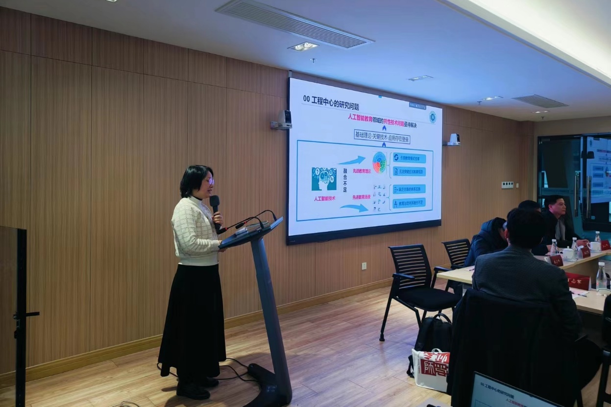 工程中心秘書長、信息機電學院林曉教授匯報了工程中心年度工作情況。林教授詳細介紹了工程中心在智能教育技術方面的主要研發成果,如構建數據驅動的教育知識圖譜和知識驅動的個性化學習路徑等,并且對獲得的成果、取得的成效和開展社會服務的情況進行了分析。