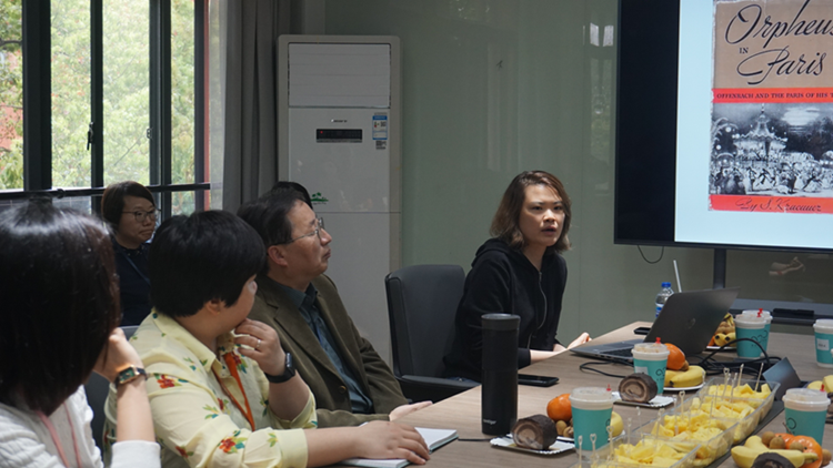 朱恒夫教授在發(fā)言中指出,教學(xué)和科研是高校的主要工作,科研又支撐著教學(xué)。他鼓勵(lì)青年教師要深入學(xué)術(shù)交流,促進(jìn)科研發(fā)展。本次沙龍圍繞“克拉考爾研究分享”這一主題,由徐亞萍副教授為大家分享了題為《雅克?奧芬巴赫和他的巴黎時(shí)代》的學(xué)術(shù)思考。作為克拉考爾研究的階段性研究,本次分享以媒介的經(jīng)驗(yàn)性和物質(zhì)性為角度,重探格弗里德?克拉考爾的寫作,尤其圍繞技術(shù)化的吸引力表面與社會(huì)存在本體之間的關(guān)系,以克拉考爾的巴黎寫作為著重點(diǎn),從而考察魏瑪寫作、巴黎寫作和紐約寫作之間的連續(xù)性和非連續(xù)性。徐亞萍副教授的講解深入淺出,在提供給大家新鮮學(xué)術(shù)視角的同時(shí),生動(dòng)而幽默的語言也引得在場(chǎng)師生哄堂大笑,現(xiàn)場(chǎng)氣氛十分活躍。