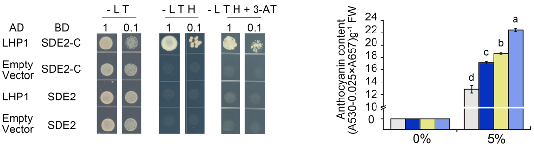 進一步研究表明SDE2-C在體內外均與多梳蛋白抑制復合體PRC1 (Polycomb Repressive Complex1) 的組分LHP1互作,并在遺傳上驗證了SDE2和LHP1在同一通路上負調控花青素的生物合成。