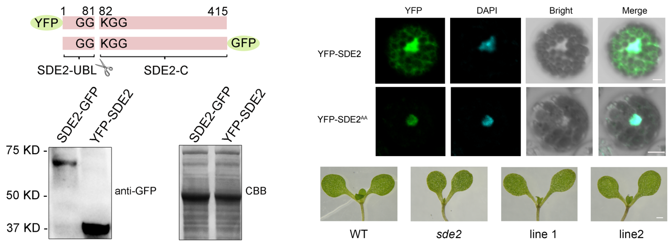 該論文借助遺傳學和分子生物學等手段發現SDE2在體內被未知因子切割產生兩部分,N-端的SDE2-UBL和C-端的SDE2-C。熒光融合蛋白結果表明SDE2-UBL定位于細胞質,而SDE2-C與全長SDE2定位于細胞核。過表達SDE2-C能完全互補sde2突變體的表型,說明SDE2依賴于SDE2-C在核內發揮功能。