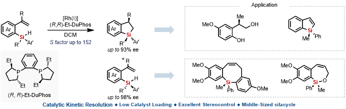 王鵬研究員課題組基于前期在催化不對稱氫硅化反應構建含硅手性化合物研究的經驗 (Angew. Chem. Int. Ed.2020, 59, 8937–8940; Angew. Chem. Int. Ed.2022, 61, e202113052),以商業可得的[Rh(cod)Cl]2為催化劑、(R,R)-EtDuPhos為手性配體,利用催化動力學拆分策略一步高效和高對映選擇性地獲得了兩類硅中心手性化合物,即環狀四取代硅烷 (dihydrobenzosiloles) 和單氫硅烷。這兩類含硅手性化合物均可進一步轉化為其他手性分子,包括硅中心手性七元環狀硅醚和八元環狀硅烷,為硅中心手性化合物的構建提供了新的思路。