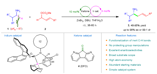 趙寶國課題組在前期發展的仿生羰基催化的基礎上,成功開發了一種新型的羰基催化劑——1,8-二氮-9-芴酮(4),運用酮/銥協同催化的策略,無需對NH2基團進行保護,在溫和條件下成功地實現了烷基伯胺α-C-H鍵的不對稱烯丙基烷基化反應,以良好的收率和優異的對映選擇性高效構建了一系列手性高烯丙基胺化合物。該研究突破了烷基伯胺α-C-H鍵的反應惰性(pKa ~ 57)制約,為羰基催化的發展和手性胺的合成提供了新的思路。