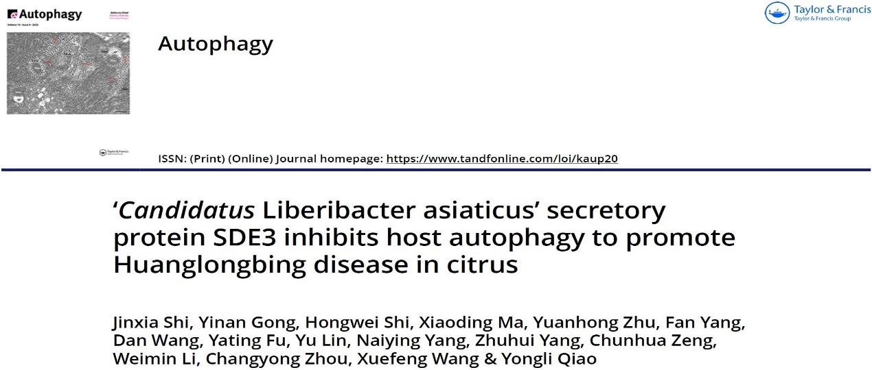 近日,生命科學學院喬永利課題組在國際知名學術期刊Autophagy上在線發表題為“Candidatus Liberibacter asiaticus’ secretory protein SDE3 inhibits host autophagy to promote Huanglongbing disease in citrus”的研究論文,該研究揭示了CLas分泌的效應子SDE3通過調控植物自噬抑制柑橘抵御黃龍病的分子機理。