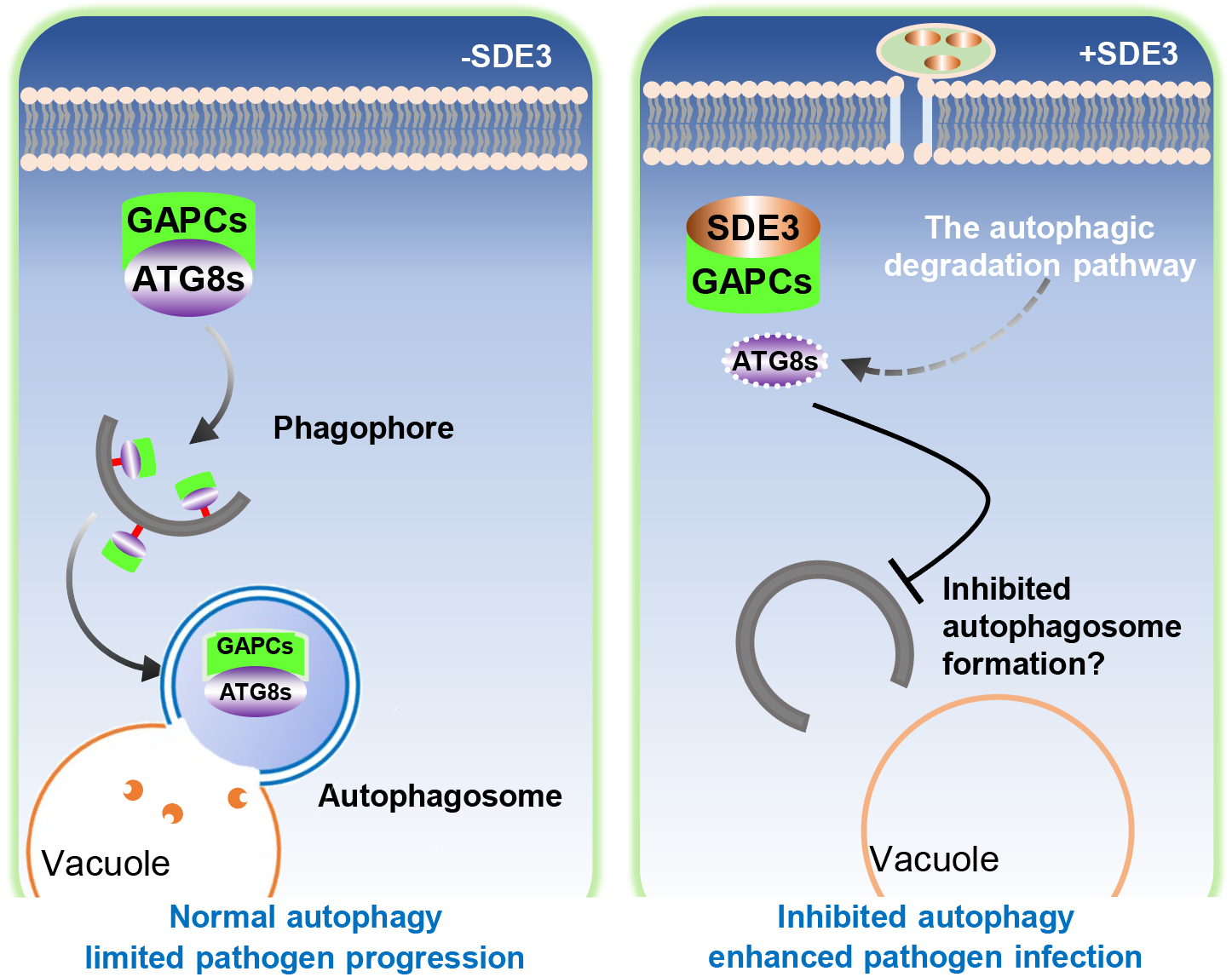 該研究發現黃龍病菌SDE3效應子的表達不僅增強了病毒和疫霉菌對煙草和擬南芥的感染能力,而且顯著地增強了柑橘潰瘍病和黃龍病的易感性。進一步研究表明SDE3效應子直接與柑橘胞質中3-磷酸甘油醛脫氫酶(CsGAPC1/2)相互作用,抑制植物的自噬。CsGAPC1/2可以與柑橘自噬相關蛋白家族CsATG8s (CsATG8A/C/D/F/G/I)直接互作,并特異性地降解了CsATG8s。感興趣的是,研究人員發現,SDE3與CsGAPC1/2的互作進一步增強了CsGAPC1/2通過自噬途徑對CsATG8s的降解。總的來說,該研究揭示了CLas效應子SDE3通過調控柑橘自噬促進其侵染的分子機制,其結果可為建立柑橘黃龍病新型防控策略提供重要的理論依據。