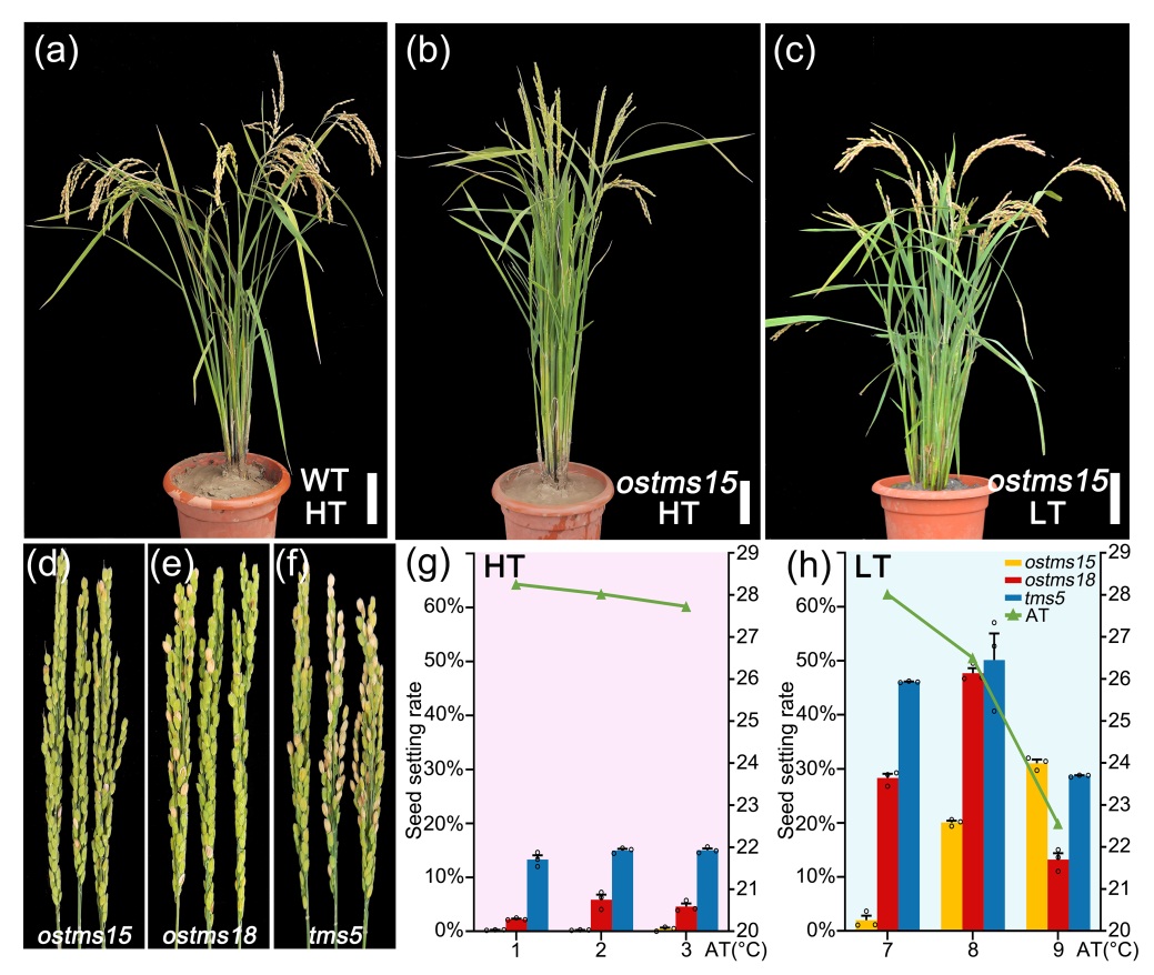 溫敏不育系已經(jīng)廣泛應(yīng)用于水稻兩系雜交制種。估計(jì)90%左右的兩系雜交制種利用帶有tms5位點(diǎn)的溫敏不育系。該不育系高溫不育性不夠穩(wěn)定,嚴(yán)重制約兩系雜交制種的廣泛應(yīng)用。課題組在前期工作中闡明了模式植物擬南芥的光溫敏不育機(jī)制 (Zhu et al., 2020, Nat Plant 6:360-367; Zhang et al., 2020, Plant Physiol 184: 923-932; Shi et al., 2021, Mol Plant 14:2104-2114; Wang et al.,2021, J Integr Plant Biol 64: 717-730)。在此基礎(chǔ)上發(fā)明了水稻光溫敏不育系的創(chuàng)制技術(shù),獲得了一系列中花11(ZH11)為背景的水稻光溫敏不育系。在2022年發(fā)表一個(gè)水稻光溫敏不育系tms18 (Zhang et al., 2022, Plant Biotechnol J 20:2023-2035)的基礎(chǔ)上,本次發(fā)表的是ostms15。