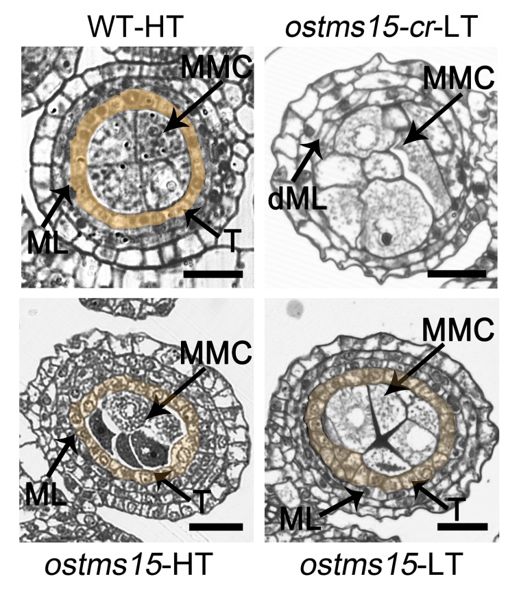 OsTMS15編碼一個(gè)已報(bào)道的在花藥中特異表達(dá)的富亮氨酸重復(fù)的受體樣激酶MSP1。ostms15不育系中該基因在TIR區(qū)段產(chǎn)生了一個(gè)Val-Glu的突變,從而導(dǎo)致溫敏雄性不育。該基因的敲除突變msp1絨氈層完全缺失。在ostms15中仍存在絨氈層細(xì)胞,但是在高溫條件下,絨氈層逐漸空泡化,無法滿足小孢子發(fā)育成花粉導(dǎo)致不育無法產(chǎn)生。在低溫條件下,ostms15的絨氈層發(fā)育趨于正常(圖2)。因此,OsTMS15/MSP1基因的點(diǎn)突變能夠起始有缺陷的絨氈層細(xì)胞發(fā)育,低溫條件下的緩慢發(fā)育能夠補(bǔ)償這種缺陷從而恢復(fù)育性。此外,該文章利用堿基編輯工具在OsTMS15基因的TIR區(qū)段上創(chuàng)制了一系列具有不同堿基替換的TGMS品系。