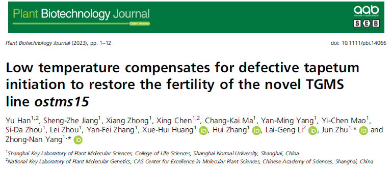 5月19日,我校生命科學(xué)學(xué)院楊仲南/朱駿教授團(tuán)隊(duì)于《Plant Biotechnology Journal》發(fā)表了題為“Low temperature compensates for defective tapetum initiation to restore the fertility of the novel TGMS line ostms15”的研究論文,該研究發(fā)現(xiàn)了一個(gè)不育性穩(wěn)定的水稻溫敏不育的新位點(diǎn)ostms15,并闡述了該位點(diǎn)溫敏不育的機(jī)制。