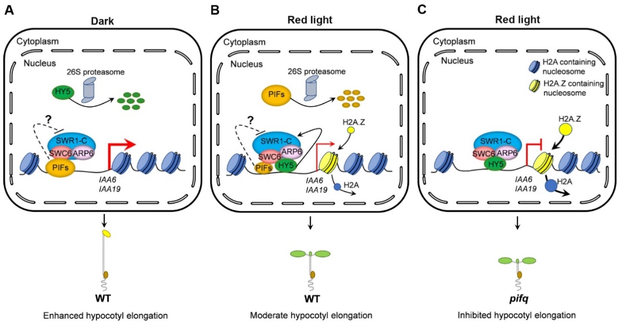 光是調控植物生長發育的重要環境信號。植物種子在土壤中發芽后,通過暗形態建成促進幼苗快速伸長,出土見光;然后通過光受體介導的光信號轉導促進光形態建成,來抑制下胚軸伸長、促進子葉和葉片的擴展以及葉綠素的合成,使幼苗得以進行光合作用,從而實現自養生長。bHLH類轉錄因子PIFs(包括PIF1、PIF3、PIF4和PIF5)是紅光/遠紅光受體光敏色素(phytochromes)的關鍵下游因子,通過促進下胚軸的伸長來抑制光形態建成過程。紅光下激活的光敏色素B (phyB)通過與PIFs互作,誘導其磷酸化和蛋白降解,從而促進光形態建成。H2A.Z作為一種組蛋白變體,在植物溫度感知、發育和開花時間調控等過程中發揮重要作用;SWR1復合體則負責催化H2A.Z在染色質中的占位。目前為止,已知PIF4和SWR1復合體在調控溫度依賴的植物生長過程中具有十分緊密的關系,但是二者發揮作用的生化分子機制尚不明確。