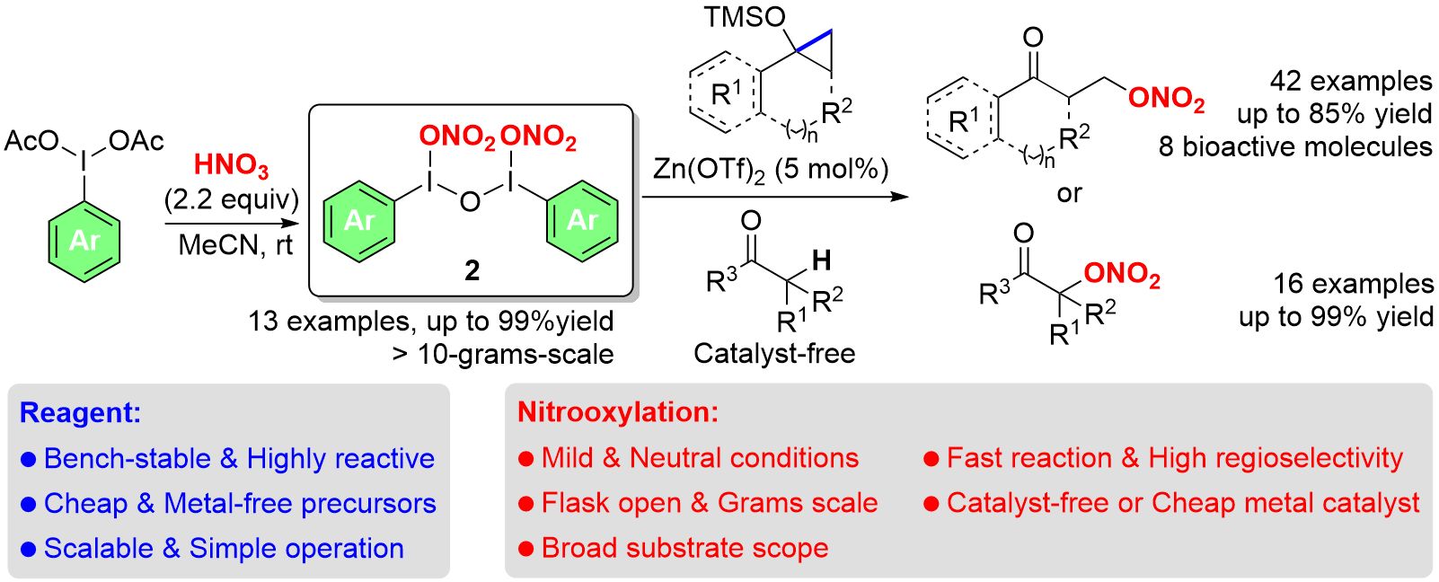 鄧清海教授課題組基于組內先前的研究經驗(Org. Chem. Front., 2016, 3, 934; Org. Lett. 2019, 21, 7315; Org. Chem. Front. 2020, 7, 3509),從廉價的二乙酸碘苯或芳基碘出發(fā),以硝酸為原料,合成了一類結構穩(wěn)定、活性可調的硝酸酯化試劑,開發(fā)了一系列綠色、安全、高效、快捷的硝酸酯化反應。同時,利用該試劑,還可以快速將硝酸酯片段引入到亞麻酸、吉非羅齊、丙磺舒、伊索克酸、吐納麝香、阿司匹林、萘普生和布洛芬等藥物或天然產物的結構中,顯示了該試劑的優(yōu)勢(如圖c所示)。該類試劑預期在有機合成及藥物合成上有著廣闊的應用前景。