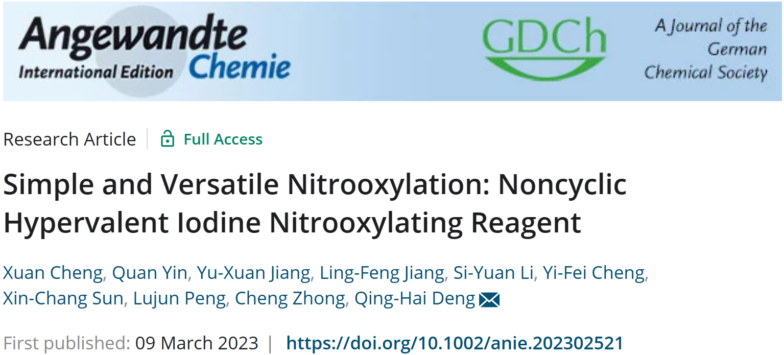 近日,化材學院鄧清海教授團隊在Angewandte Chemie International Edition (IF = 16.8)上發(fā)表論文“Simple and Versatile Nitrooxylation: Noncyclic Hypervalent Iodine Nitrooxylating Reagent”,發(fā)展了一類新型非環(huán)高碘硝酸酯化試劑,為硝酸酯的安全、綠色、高效制備提供了新方法。上海師范大學為唯一通訊單位,我校2021級博士生成軒為第一作者,鄧清海教授為論文通訊作者。