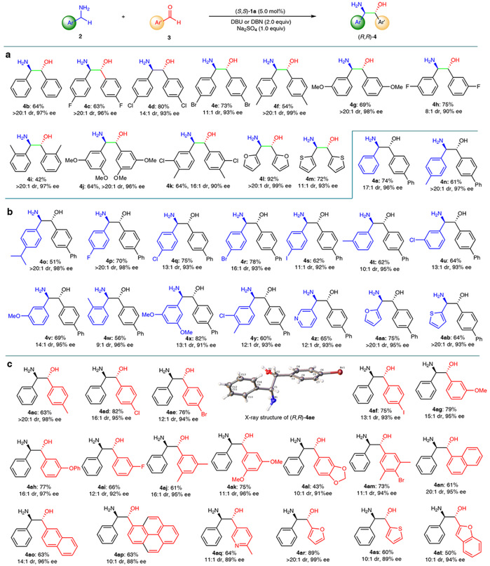 羰基催化能促進伯胺α C-H鍵的直接不對稱轉(zhuǎn)化,是一種受生物過程啟發(fā)的新型催化模式,已被成功地應(yīng)用于甘氨酸酯的不對稱仿生Mannich反應(yīng)、仿生Aldol反應(yīng)、α-C Michael加成反應(yīng)和α-C烯丙基化等反應(yīng)。然而,到目前為止,該策略主要局限于含有強吸電子基團的活化伯胺,例如α-氨基酸酯(pKa~24)、(2-吡啶基)甲胺等。為了實現(xiàn)惰性伯胺化合物芐胺的α C-H鍵的轉(zhuǎn)化,作者發(fā)展了一系列含有方酸側(cè)鏈的手性吡哆醛催化劑,并應(yīng)用于芐胺α C-H鍵對芳基醛的不對稱加成反應(yīng)。在篩選出最佳的催化劑以及反應(yīng)條件后,對反應(yīng)的底物進行了考察(圖2),各種芳基甲胺和芳基醛都能很好地適用于該轉(zhuǎn)化,以較好的收率和優(yōu)秀的非對映選擇性、對映選擇性得到一系列的手性β-氨基醇化合物。