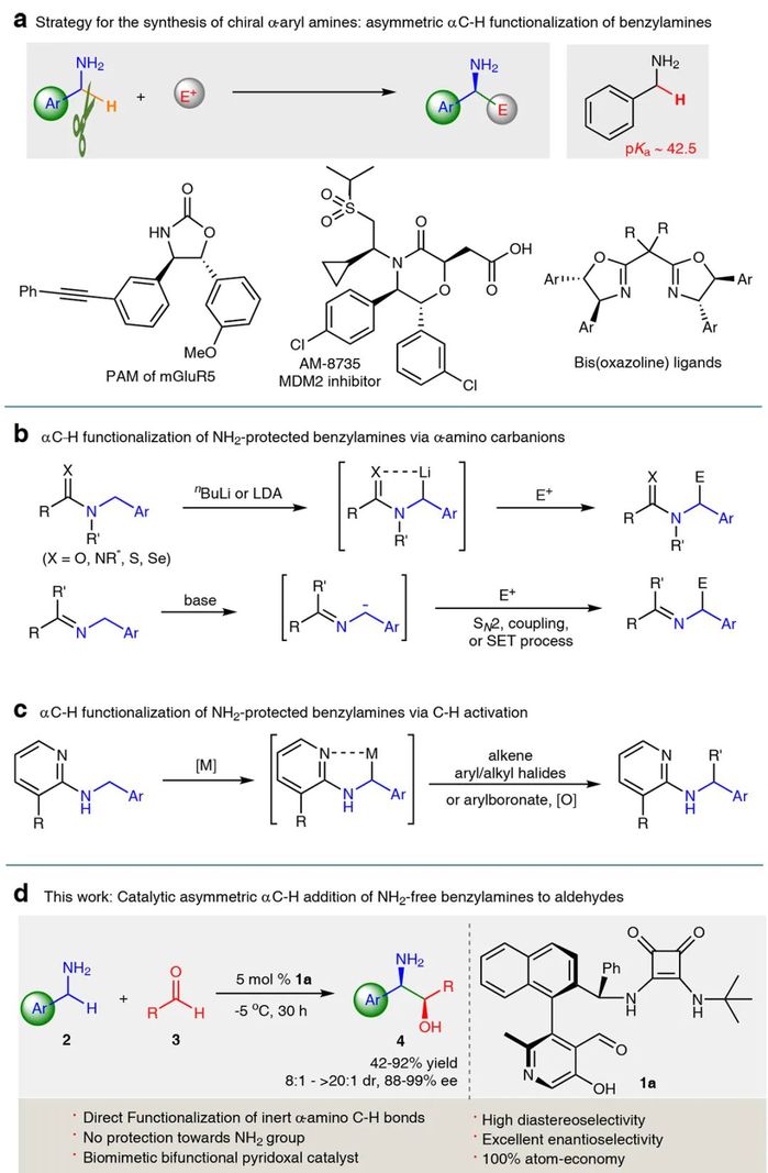 手性胺是一類非常重要的化合物,在醫(yī)藥、天然產(chǎn)物、精細化學品、材料、催化等領(lǐng)域都有廣泛應(yīng)用,發(fā)展手性胺的高效構(gòu)建新策略有重要意義。簡單伯胺,如芐胺,是一類易得的化工原料,其α C-H鍵的直接官能團化是合成手性胺的高效新策略。但該反應(yīng)面臨兩個巨大挑戰(zhàn):伯胺的NH2基團反應(yīng)活性高,嚴重干擾轉(zhuǎn)化;芐胺的α C-H鍵酸度極低(pKa ~ 42.7),難以活化。本研究工作以仿生的手性吡哆醛為催化劑,運用羰基催化的策略,突破芐胺α C-H鍵的反應(yīng)惰性,無需對NH2基團進行保護,在溫和條件下實現(xiàn)芐胺α C-H鍵對醛的不對稱加成,高效構(gòu)建重要化合物手性β-氨基醇。