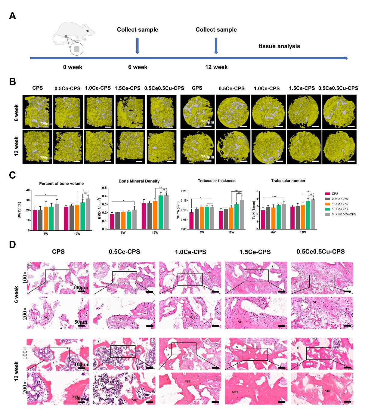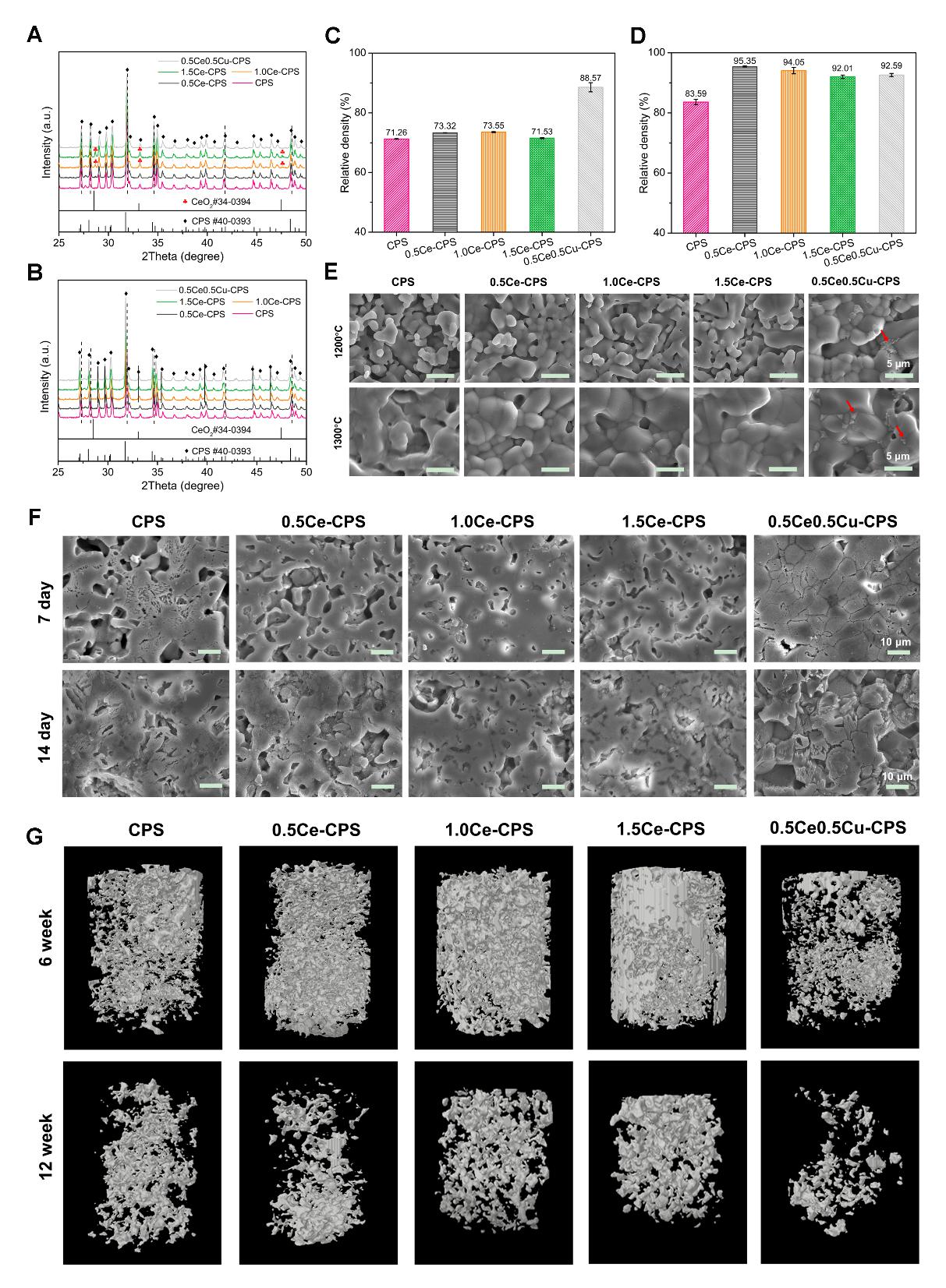 本研究中,作者利用生物功能性元素鈰 (Ce)和銅 (Cu)協同調節硅磷酸鈣生物陶瓷 (Ca5(PO4)2SiO4, CPS)的物相組成和微觀結構,對其降解性、生物活性和生物安全性進行了深入研究。
