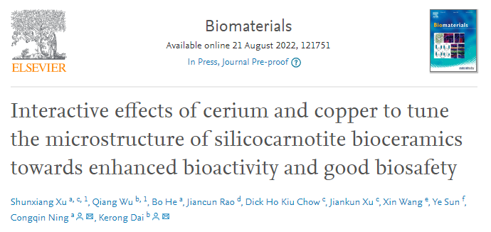 [1] Shunxiang Xu?, Qiang Wu?, Bo He, Jiancun Rao, Dick Ho Kiu Chow, Jiankun Xu, Xin Wang, Ye Sun, Congqin Ning*, Kerong Dai*. Interactive effects of cerium and copper to tune the microstructure of silicocarnotite bioceramics towards enhanced bioactivity and good biosafety. Biomaterials, available online 21 August 2022, 121751. https://www.sciencedirect.com/science/article/pii/S014296122200391X