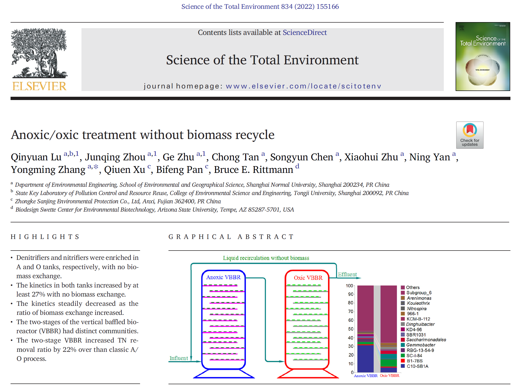 近日,國際知名期刊《Science of the Total Environment》在線發表了我校環境與地理科學學院張永明教授團隊的研究論文“Anoxic/oxic treatment without biomass recycle”在無污泥循環水處理工藝方面獲得重大突破。
