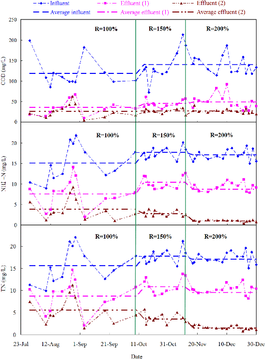 當將好氧VBBR(Ox-VBBR)與缺氧VBBR(An-VBBR)串聯在一起用于實際的城鎮污水處理時,在不同回流比(R)條件下,進出水的COD、氨氮和總氮的濃度變化如圖2所示。從圖2可以看出,在回流比為200%時,最后出水總氮的平均濃度僅有1.5 mg/L,達到了極限脫氮的水平。