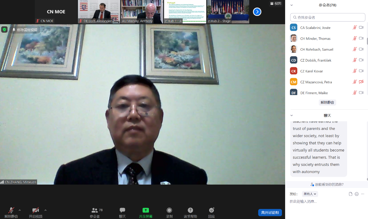 張民選教授在發(fā)言中介紹了中國“通過國培計劃、振興鄉(xiāng)村教育”和“發(fā)展信息技術教育、提升教師信息技術能力”的兩大優(yōu)先發(fā)展事項,以此促進鄉(xiāng)村教育高質(zhì)量發(fā)展和全體兒童的優(yōu)質(zhì)教育與福祉。張民選教授還應邀分享了中國三大最新舉措:政府與教師工會共同舉辦“青年教師教學賽”;開展“雙減工作”,延長學校課后服務;關注學生身心健康,強化教師專項培訓,提升教師對學生社會情感和心理支持能力。