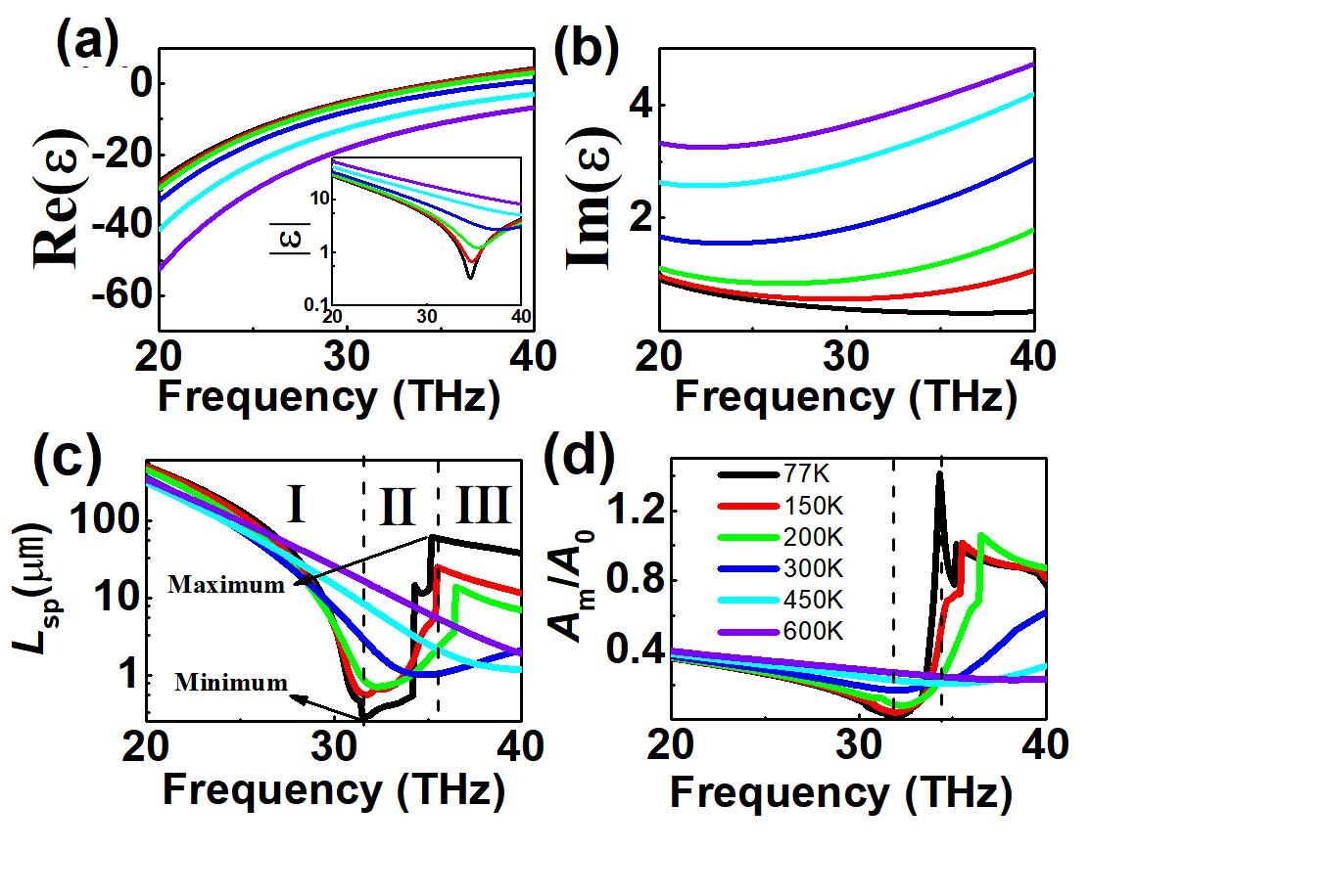 不同溫度下3D DSM介電常數的實部(a)和虛部(b),(c)傳播長度,(d)歸一化有效模式面積。3D DSM層的費米能級為0.12 eV