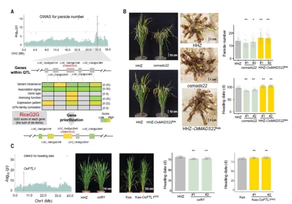 各類復雜農藝性狀由哪些基因決定、如何高效解析、基因之間有何聯系,一直以來都是水稻等作物遺傳研究的基本問題,也是實現水稻智能化育種的重要理論基礎。2017年初,生命科學學院組建植物數量遺傳學科研團隊,聚焦國家重大戰略目標,錨定該項研究課題,以“十年磨一劍”的堅定決心和頑強意志,只爭朝夕、埋頭苦干。在八年的研究過程中,團隊攻克了一個又一個難題,構建了縝密而巧妙的研究思路,提前設計研究過程每個階段的詳細“圖紙”;歷經漫長而艱辛的群體構建之路,創制了研究所需的大規模實驗材料,進行了基因組和表型組的測定;摸索出精細且具有創新性的分析方法,挖掘隱藏在大數據之下的重要基因和遺傳學規律;最終取得突破性研究成果。