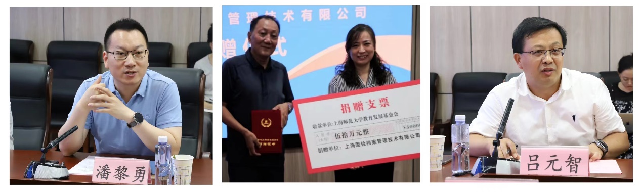 潘黎勇致歡迎辭。他首先感謝上海固銓檔案管理技術有限公司對學院發展的大力支持,并對人文學院近年來在專業建設、學術科研、人才培養以及社會服務中取得的成績作了介紹。他指出,今年下半年上海師范大學即將迎來70周年華誕,在這一重要的時間節點上,企業的捐贈有助于形成人才培養、學術研究的強勁動力,對于推動學院高質量發展將發揮重要作用。