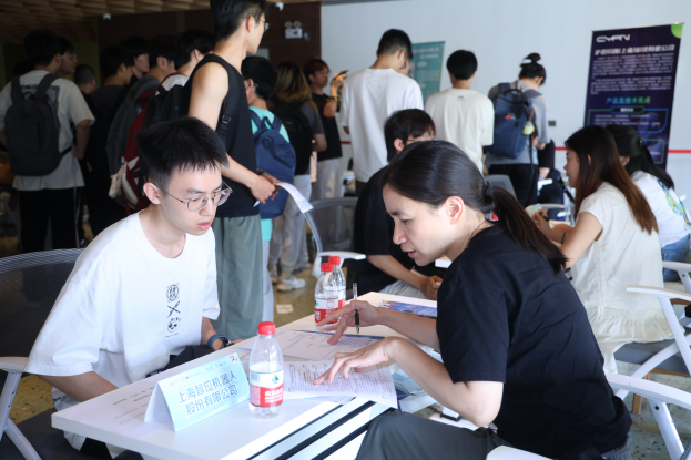 本次訓練營開營儀式上,共有13家來自徐匯區、漕河涇開發區的優質企業參加,涵蓋大模型、人形機器人、物聯網、新能源技術等領域,提供實習崗位30余個。同時,活動現場設有專門的15分鐘就業指導咨詢區,為同學們提供簡歷修改等服務。現場100多名學生積極參與各類崗位的面試,他們的出色表現贏得了企業方的高度認可和好評,面試反響熱烈。