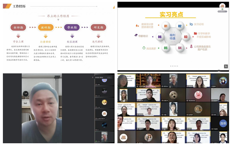 此外,學院還依托“申幼逐夢”生涯發展工作室開展了暑期職業訓練營系列講座。7月14日邀請就職于昂立青少兒成長中心的校友肖為溪分享自己從新師期、教研期、帶班期到研發期四個階段的職場成長與心路歷程,邀請昂立教育校招經理童卓遠從建校經歷、文化活動、現有業務、實習崗位等板塊詳細介紹有關情況。周澤龍就昂立教育對開展訓練營活動的支持表示感謝,并鼓勵同學們積極投身職業體驗,在親身實踐中加深對教培機構等行業的有關了解,拓寬就業視野,明晰擇業規劃,提升就業勝任力。