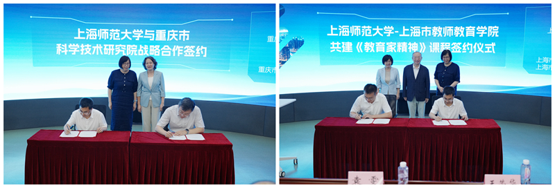 會上,我校副校長李曄分別與上海市教師教育學院院長王洋、重慶市科學技術研究院副院長韓鵬簽署了《教育家精神》課程共建協議、人工智能技術攻關的戰略合作協議;上海師范大學校長袁雯聘任了五位教育家精神宣講團導師并授牌了四家教育家精神踐行基地。