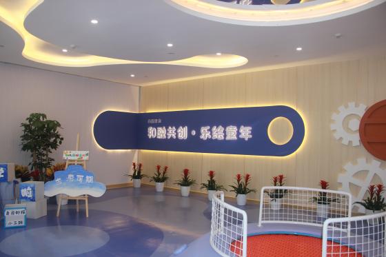 這所將“科創”作為園名的新幼兒園,是我校與臨港新片區管委會、浦東新區教育局戰略合作框架協議之下設立的學校,設計規模為21個班。走進大門,不規則形狀的乳白色吊頂和藍紫色地面營造出無垠宇宙的空闊感,飛碟造型的小蹦床和墻面上的航天員影像,讓科幻感撲面而來。墻上八個大字——“和融共創 樂繪童年”,正是附屬浦東臨港科創幼兒園的辦園理念。