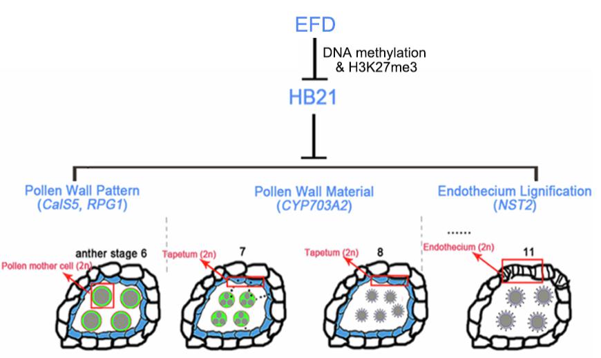 因此,該研究發現一條控制花藥發育過程的全新遺傳通路——“EFD-HB21-下游基因” (見下圖)。這條通路經表觀遺傳的特異修飾形成雙重表達抑制,由此對花藥發育各過程進行系統性的調控,從而保證花粉的正常發育。