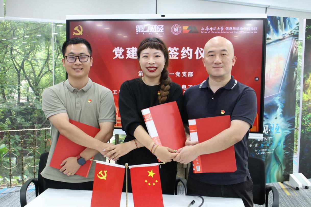 信機學院人工智能黨支部書記安康、人工智能+教育黨支部書記林峰與第一財經第一黨支部書記彭佳共同簽署黨支部共建協議,推動黨建工作創新與發展,基于各自在AIGC領域的研究與應用,共同開展科研項目與技術攻關,在合作中不斷探索新的合作領域與合作方式,共同提升服務社會的能力。