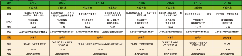 “上海之春”國際音樂節(jié)每年于4月28日拉開帷幕。今年的“上海之春”再度走進(jìn)上海師范大學(xué)校園,于5月8日至18日舉辦校園藝術(shù)展示周,為我校師生和廣大市民奉獻(xiàn)15場“專場音樂會”、“公益講座”、“舞蹈教學(xué)展示課”等系列公益活動。
