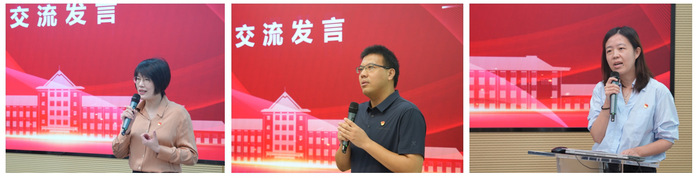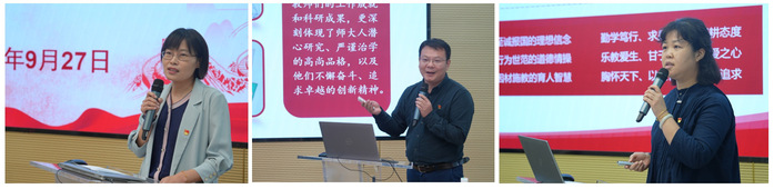 徐松如《以“學、集、研、講”一體化模式,大力弘揚教育家精神》為題,分享了檔案館(校史館、博物館)黨支部以弘揚教育家精神為指引,充分發揮檔案資源優勢,從學校、學科、學者、學術、學生“五學”入手,系統梳理并總結學校70年的發展成果、辦學成果、學術成果,展現深厚的育人自信、師范自信、學術自信,逐漸形成了“師大文脈”“致敬大先生”“口述校史”等欄目,整理和挖掘師大“大師”,的珍貴檔案,講好師大教育家故事,傳播師大教育家聲音,堅守“為黨管檔、為校守史、為民服務”的初心。張益以《導學共進,師道傳承》為題,分享了研究生院、研工部黨支部以“我心目中的好導師”評選為載體挖掘學生身邊的導師故事,以教育家精神為引領,導學思政,通過凝聚育人合力,探索“五導”機制,打造全方位培養學生模式。她認為:“管理育人、服務育人”正是弘揚教育家精神最豐沃的田野,是踐行教育家精神最堅實的基地,要把普通的工作做得不普通,把平凡的工作做得不平凡,以最赤誠的情懷、最無私的愛心、最有力的行動詮釋教育家精神。王珊以《弘揚踐行教育家精神,助力打造高素質專業化教師隊伍》為題,圍繞如何落實好黨中央推進教育強國建設的要求,弘揚踐行教育家精神,助力學校高素質專業化教師隊伍的打造,培養出更多的時代“大先生”,從堅守初心、打造“大格局”;嚴以律己,修好“大德行”;心懷夢想,講好“大學問”三個方面進行闡釋。作為黨務工作者要始終堅守教育的戰略屬性,把黨的工作與學校的學科建設、人才培養相結合,聚焦新時代新任務,在加強黨組織建設、發揮黨組織的戰斗堡壘作用和黨員的先鋒模范作用等方面,搭建好推進事業發展與高質量黨建深度融合的平臺,讓更多的有“大學問”的教師可以大展身手。