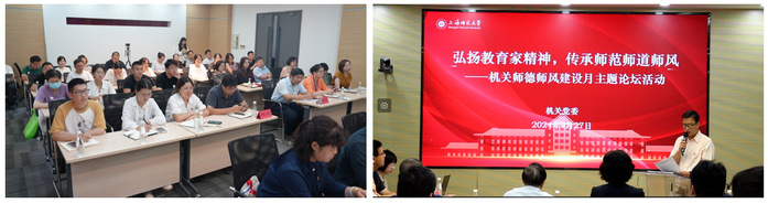 為深入學習貫徹習近平總書記在全國教育大會上的重要講話精神,大力弘揚教育家精神,增強機關廣大黨員、干部、教職工為黨育人、為國育才的責任感和使命感, 9月27日上午,機關黨委在會議中心3-4號會議室舉行“弘揚教育家精神,傳承師范師道師風”----機關師德師風建設月主題論壇活動。上海師范大學原校長楊德廣教授、巡察辦正處級專職副主任、監督檢查室副主任王珊,檔案館(校史館、博物館)館長徐松如,研究生院、研究生工作部副部長張益,組織部張文青參加論壇并作主旨發言,機關黨委書記曹誠作總結,機關黨委、各黨支部支委代表、黨員代表、機關新進教職工等近50人參加會議。會議由機關黨委副書記陳璽球主持。