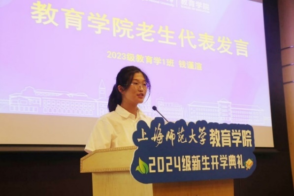 來自2023級教育學1班的錢謹渲同學作為老生代表,分享了自己大學生活的親身經(jīng)歷,鼓勵同學們多去嘗試、勇于挑戰(zhàn),合理規(guī)劃大學生活,積極參與團隊合作,重視個人成長,踐行師范生的使命與擔當。2024級小學教育(理科)2班的向凌霄同學作為新生代表,結合自己的實際經(jīng)歷講述了對教育的感悟和憧憬,并呼吁全體新生培養(yǎng)扎實學識,始終保持昂揚進取的姿態(tài)和永不懈怠的精神,為青春筑夢,為時代育人。