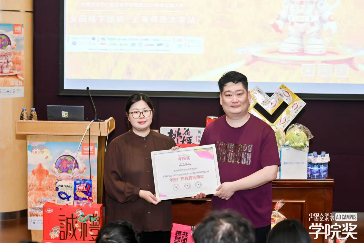 廣告人文化集團市場總監袁林先生代表學院獎組委會為上海師范大學影視傳媒學院頒發“年度廣告教育推動獎”,由上海師范大學影視傳媒學院廣告系主任吳冰冰老師作為校方代表上臺領獎,并向組委會表示感謝。