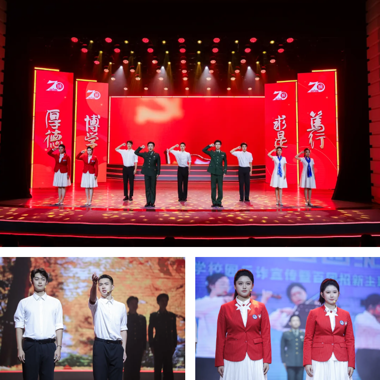 影視傳媒學院、退役軍人學院學生朗誦《榮光》,師范生、學生黨員、退伍兵、附屬學校教師、進博會志愿者用鏗鏘有力的青春誓言,表達強國有我的理想和志向。