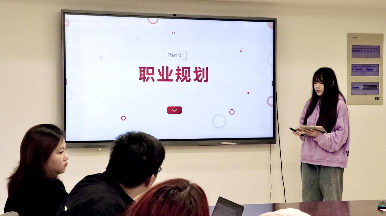 隨后,邀請兩位優秀的實習代表上臺分享,用她們的實踐經歷為在座的同學點亮職業生涯的燈塔。首先進行分享的是來自21級廣播電視學1班的蔣隆炎同學,她以“百草初綻探春意,雨翠微傾步未停”為主題,借春日之喻,表達了自己將一直懷揣著春天般的希望,葆有不斷前行的決心。蔣隆炎細致回顧了從大一至今的實習歷程,從興趣驅動的探索到多領域嘗試的跨越,這些經歷使她逐漸對自我定位有了更清晰的認知,每一次實踐都拓寬了她的視野與人生體驗。