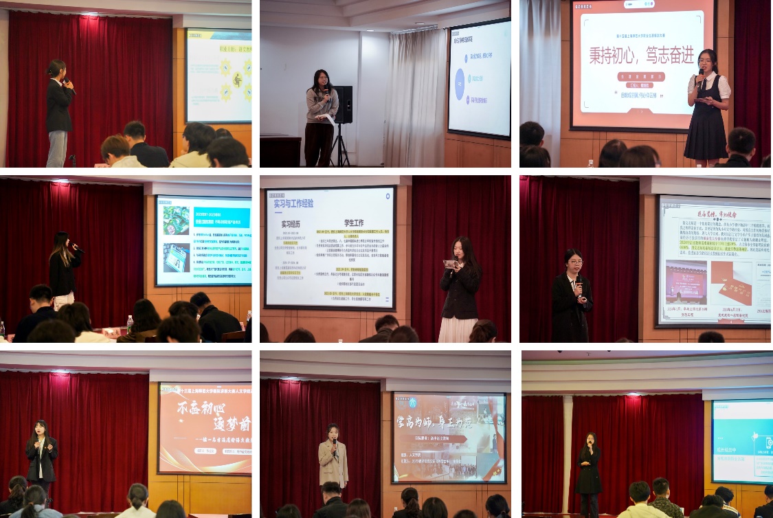 總結表彰大會結束后舉行了校第十五屆職業生涯規劃大賽、第十三屆模擬求職大賽人文學院院賽決賽。經過前期報名、初篩,共有10名同學進入院賽決賽環節。決賽共分為自我陳述、評委提問和觀眾提問三個環節,選手圍繞通用素質、崗位能力、發展潛力等維度開展現場求職,從職業目標、行動成果、目標契合度等方面展示了自己職業生涯的規劃。