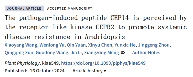 近日,孟祥宗課題組在Plant Physiology期刊上發表了題為“The pathogen-induced peptide CEP14 is perceived by the receptor-like kinase CEPR2 to promote systemic disease resistance in Arabidopsis”的學術論文,揭示了新型免疫誘導小肽CEP14及其受體CEPR2在調控植物系統抗病性中的功能及作用機制。