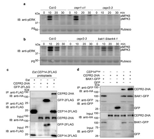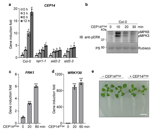 擬南芥中C末端編碼肽(CEP)家族由兩個亞家族組成:由CEP1-CEP12成員組成的I亞家族在根的形成和氮饑餓反應中發揮關鍵作用,而II亞家族(CEP13-CEP15)的功能則未知。該研究中,作者發現擬南芥中II亞家族CEP成員CEP14經水楊酸信號途徑被病原菌誘導表達;且CEP14小肽可誘導擬南芥產生多種免疫應答反應。