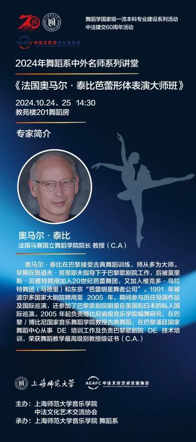 10月24日至25日,正值我校建校70周年、中法建交60周年之際,圍繞舞蹈學(xué)國家一流本科專業(yè)高水平建設(shè)項目的需求,實現(xiàn)高質(zhì)量人才培養(yǎng)與學(xué)科發(fā)展的核心目標(biāo),我校音樂學(xué)院舞蹈系邀請法國馬賽國立舞蹈學(xué)院院長奧馬爾·泰比教授與中法文化藝術(shù)交流協(xié)會執(zhí)行副會長高雷先生來訪,為我校音樂學(xué)院舞蹈系學(xué)生開展了為期兩天的芭蕾形體表演大師班。
