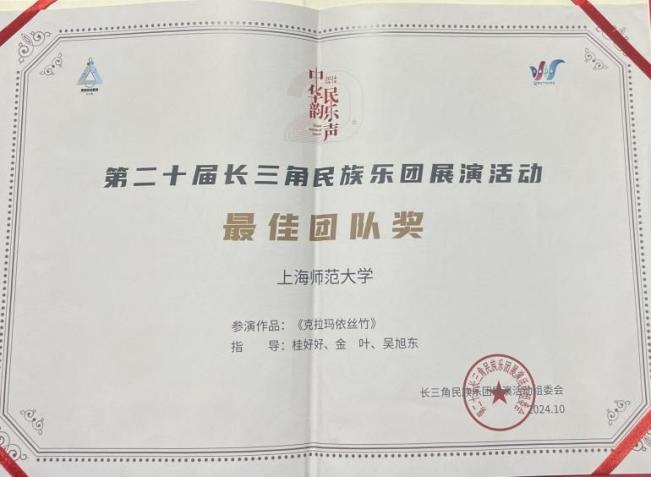 經過大家的團結一致與不懈努力,由我校音樂學院民樂系青年教師桂好好、我校青年民族管弦樂團藝術總監、民樂系青年教師金葉和吳旭東指導的青年民族管樂團獲得了第二十屆長三角民族樂團展演活動“最佳團隊獎”。