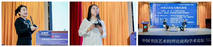 之后,進入專家主旨報告環節。這一環節由丘新巧主持。邱振中、胡抗美、駱冬青分別作《書法:理論的建構與思想的推進》《書法藝術的本體追問——現代書學建構的基本問題》《論狂草拓撲學——論書法圖象的演極》主旨報告。在座專家學者與師生聚精會神、翹首以觀,并報以熱烈掌聲。