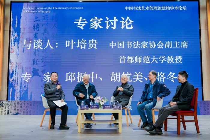 葉培貴主持了隨后的專家對談環節。邱振中、胡抗美、駱冬青、丘新巧參加對談。針對四十余年來書法理論研究成果、當代書法理論研究現狀、書法本體理論基礎等作出討論。整個環節有交鋒、有互動,氣氛輕松而熱烈。