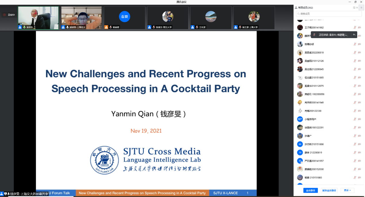 上海交通大學的錢彥旻副教授作報告“New Challenges and Recent Progress on Speech Processing in A Cocktail Party”,總結了近年來雞尾酒會問題中語音處理的進展以及未來的新挑戰和潛在方向。