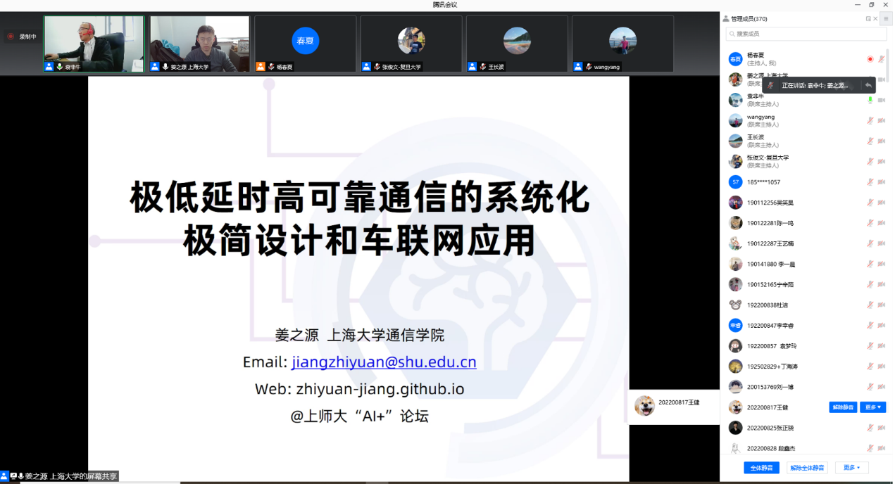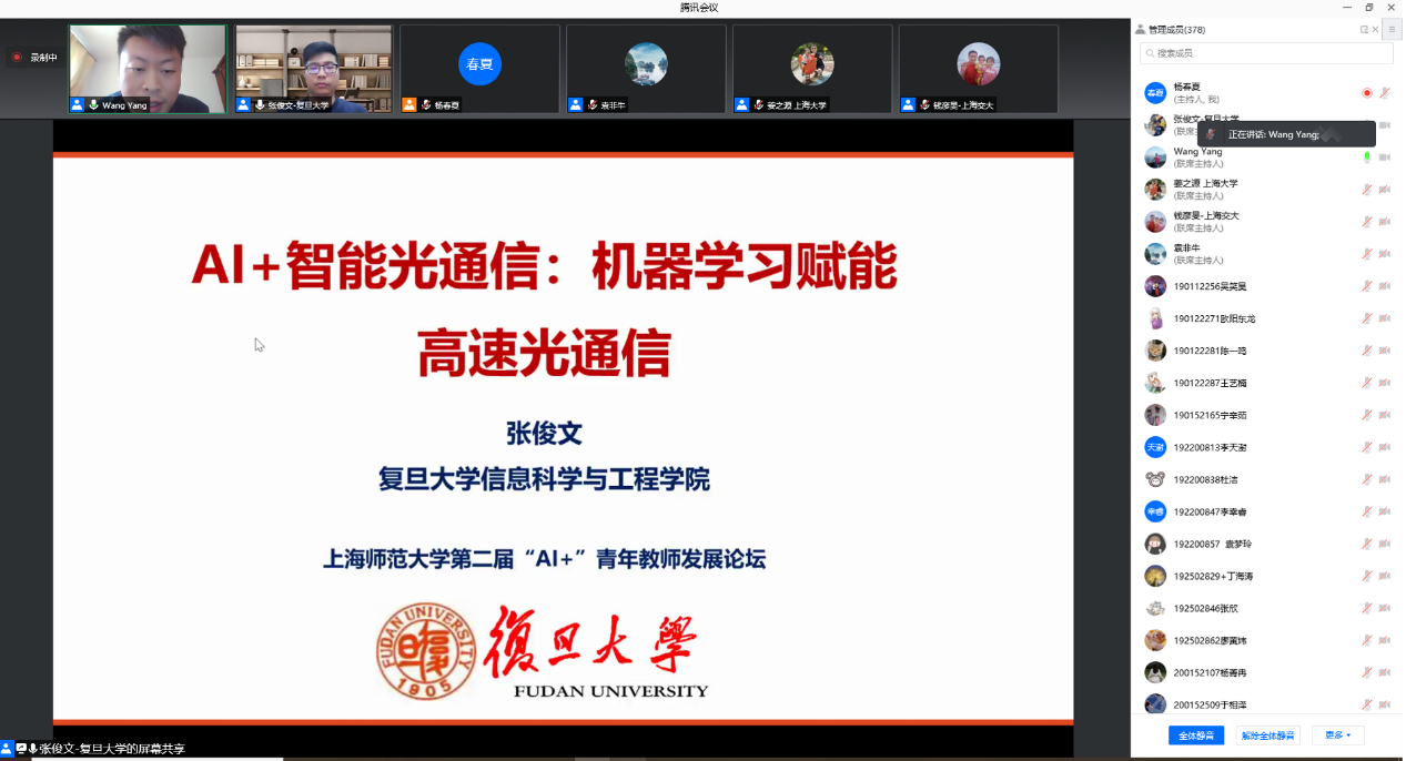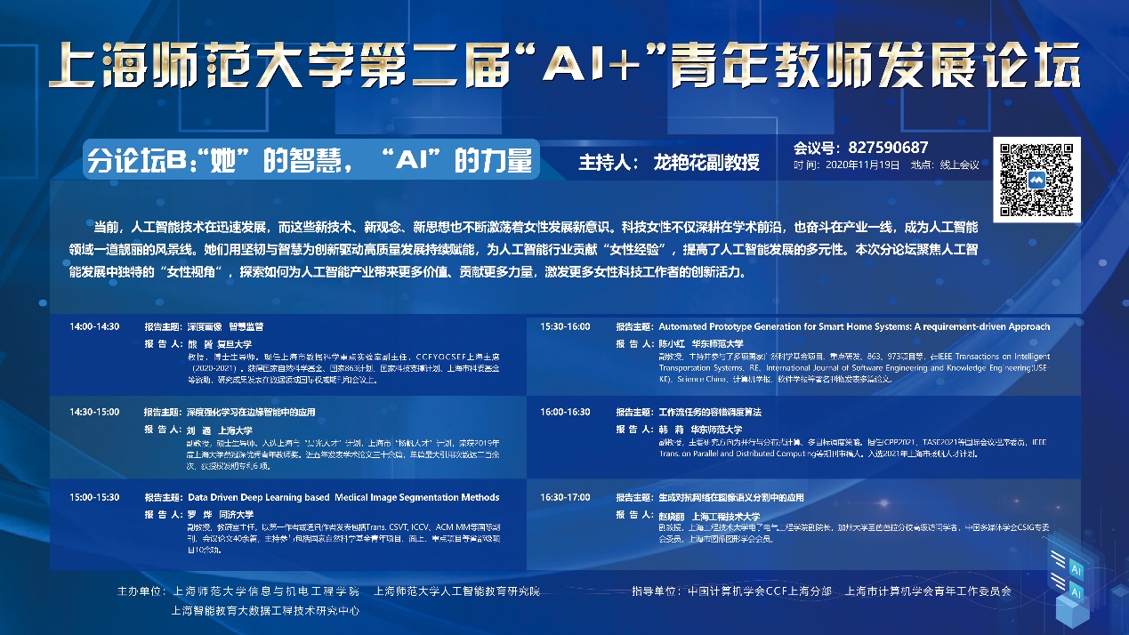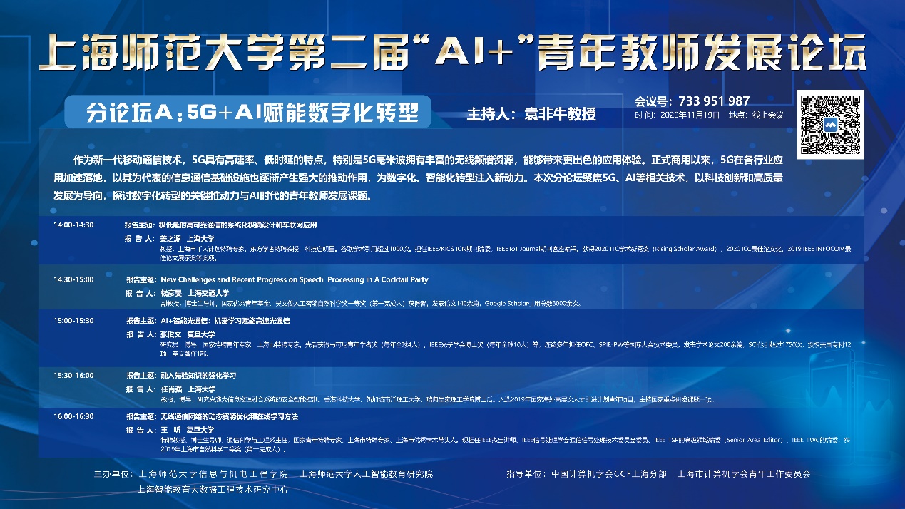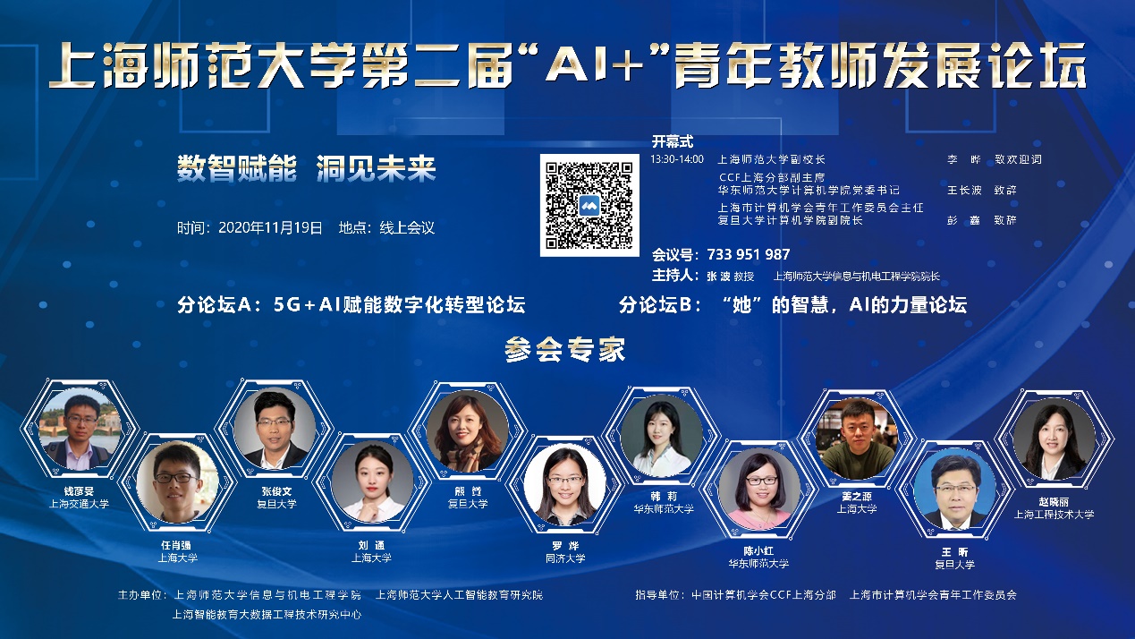 11月19日下午,上海師范大學第二屆“AI+”青年教師發展分論壇活動以騰訊會議形式在線上舉辦。兩個分論壇分別以“‘她’的智慧 ‘AI’的力量”和“‘5G+AI’賦能數字化轉型”為主題,來自上海大學、上海交通大學、上海工程技術大學、同濟大學、復旦大學、華東師范大學等多所高校的11位專家學者,我校信息與機電工程學院青年教師和部分研究生、本科生近700人參加論壇。